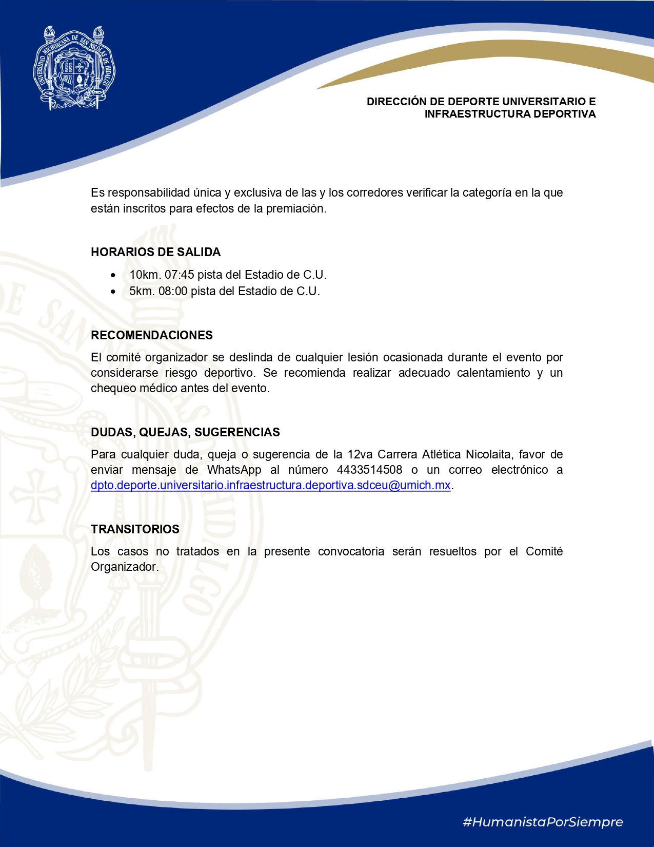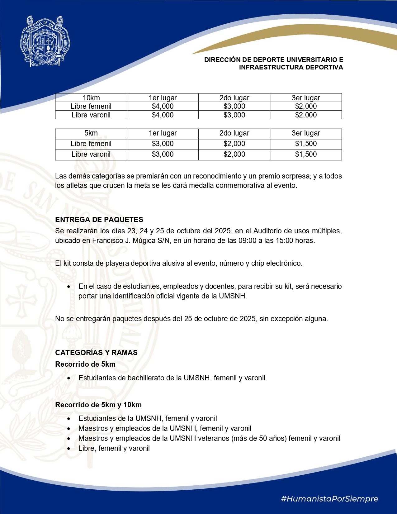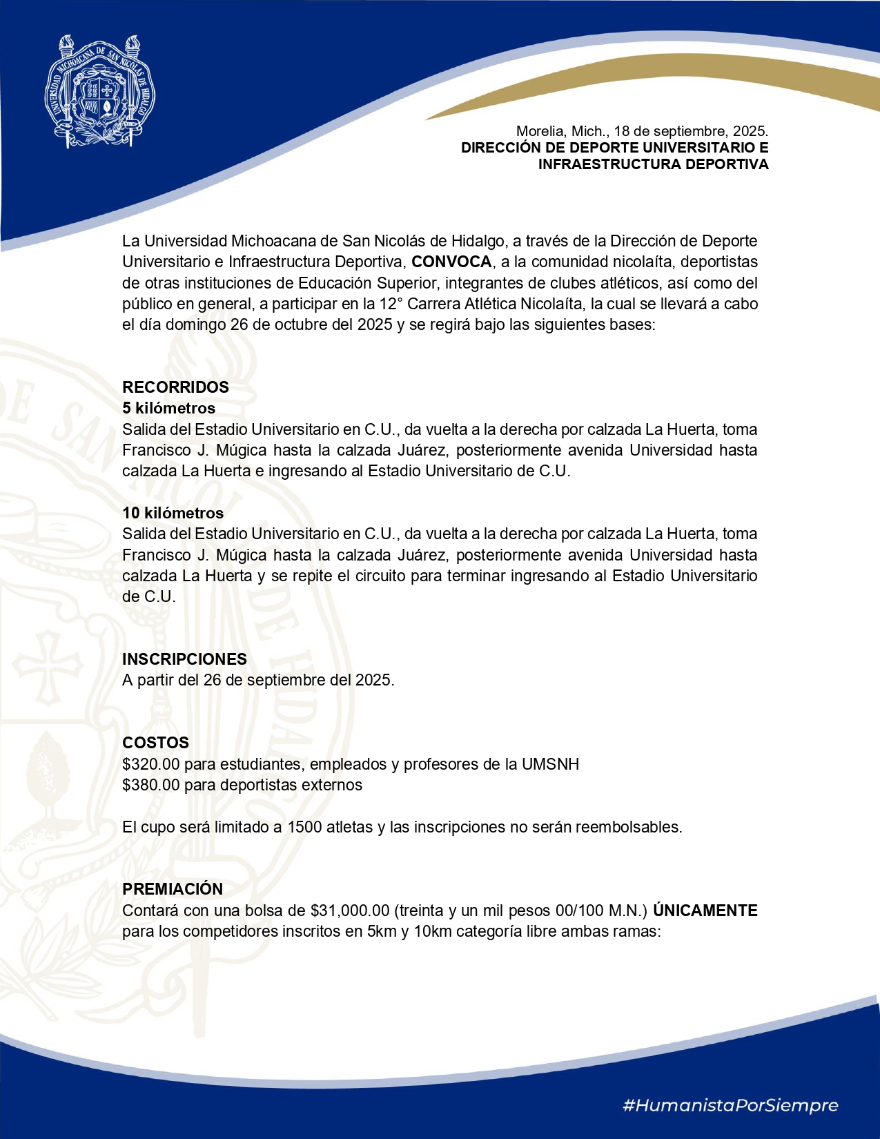 Salida del Estadio Universitario en C.U., da vuelta a la derecha por calzada La Huerta, toma Francisco J. Múgica hasta la calzada Juárez, posteriormente avenida Universidad hasta calzada La Huerta y se repite el circuito para terminar ingresando al Estadio Universitario de C.U.